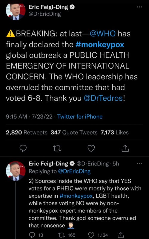 The declaration was made unilaterally, in direct contradiction of independent review panel advice, by WHO director Tedros Adhanom Ghebreyesus. Tedros made the declaration despite a lack of consensus among members of the WHO’s emergency committee on the monkeypox outbreak, and in so doing overruled his own review panel, who had voted 9 against, 6 for declaring the PHEIC. Tedros asserted that this committee of experts (who met on Thursday) was unable to reach a consensus, so it fell on him to decide whether to trigger the highest alert possible.