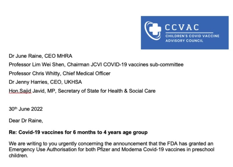 We would urge you to consider very carefully the move to vaccinate ever younger children against SARS-CoV-2, despite the gradual but significant reducing virulence of successive variants, the increasing evidence of rapidly waning vaccine efficacy, the increasing concerns over long-term vaccine harms, and the knowledge that the vast majority of this young age group have already been exposed to SARS-CoV-2 repeatedly and have demonstrably effective immunity. Thus, the balance of benefit and risk which supported the rollout of mRNA vaccines to the elderly and vulnerable in 2021 is totally inappropriate for small children in 2022.