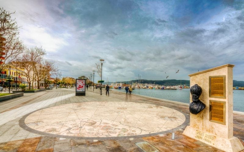 Canakkale, Turkey. The Piri Reis map displayed next to a monument honouring Piri Reis. Image via Shutterstock.