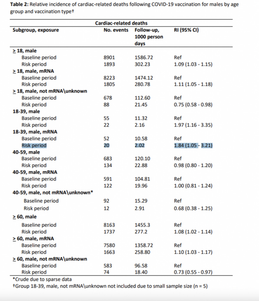 Just using the unadjusted raw numbers, one can calculate the expected numbers of deaths in the 18-39 year old males post mRNA vaccine would have been 10 instead of 20 the first 28 days if risk were equal over the entire 25 weeks, so the signal we are talking about is 10 extra deaths total and an approximate doubling of expected number of cardiac-related deaths proximal to the vaccine (I spoke with Joe about the 84% reported and this was arrived at adjusting for seasonal variation in death rate). However, given the wide confidence intervals, this may have been just 1 or 2 deaths away from expected… so it’s a small number of deaths and a very uncertain signal.