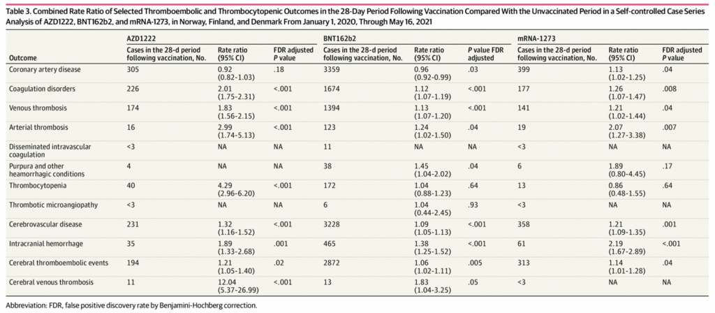 Furthermore, the Nordic and Florida studies ran a large number of tests, and if a p value of <0.05 is used this would mean 5% would be significant just by chance. You can see above that the Nordic study corrected for this using a “false discovery rate adjusted p-value”. Florida could have considered such an adjustment for running tests in so many demographics but did not.