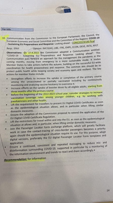 Finally, in a more recent May 17 tweet, Virginie Joron shared the below photo of a Commission document that was distributed to the EU Parliament’s Internal Market and Consumer Protection Committee and that includes, in effect, a “vaccination strategy” for the fall. This document likewise “targets” the unvaccinated, its first bullet calling on EU member states to: “Strengthen efforts to increase the uptake or completion of the primary course among the unvaccinated or partially vaccinated including by continuously monitoring and analysing vaccine hesitancy to overcome it.”