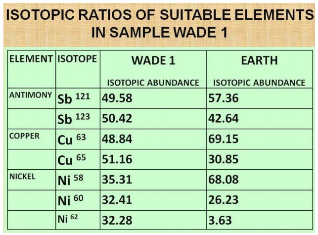 The isotopic ratios of three elements in sample W-1 (antimony, copper, and nickel) were highly skewed in comparison to their terrestrial values, suggesting that the samples came from an unknown source.