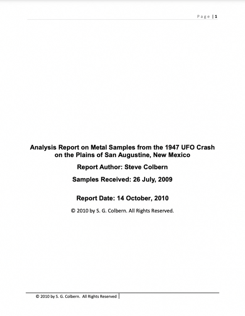 A ground-breaking study led by Material Physicist Steven Colbern, currently the CEO and Co-Founder of Neutron Star Nanotechnology in Oxnard, California. Mr. Chuck Wade of the crash at San Augustine, New Mexico, submitted six metal samples. A dissecting microscope at 8x-40x magnification was used to capture digital pictures of the materials.
