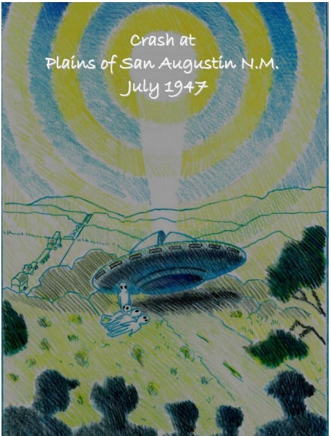Seven unknown craft crashes (gifts?) would occur in New Mexico between 1945–1950. Starting in August 1945, when two boys, Jose and Reme, ages 9 and 7, were searching for a cow that was ready to deliver a calf on a ranch west of Trinity Site in San Antonio, New Mexico. They heard a thunderous explosion, identical to the one they had heard a month earlier. They followed the sound and spotted a 25–30 foot avocado-shaped vessel containing two living beings. The youngsters hid for many days, watching while the military collect the crashed wreckage. Jose and Reme extracted a piece of this spaceship, which one of them still possesses today.