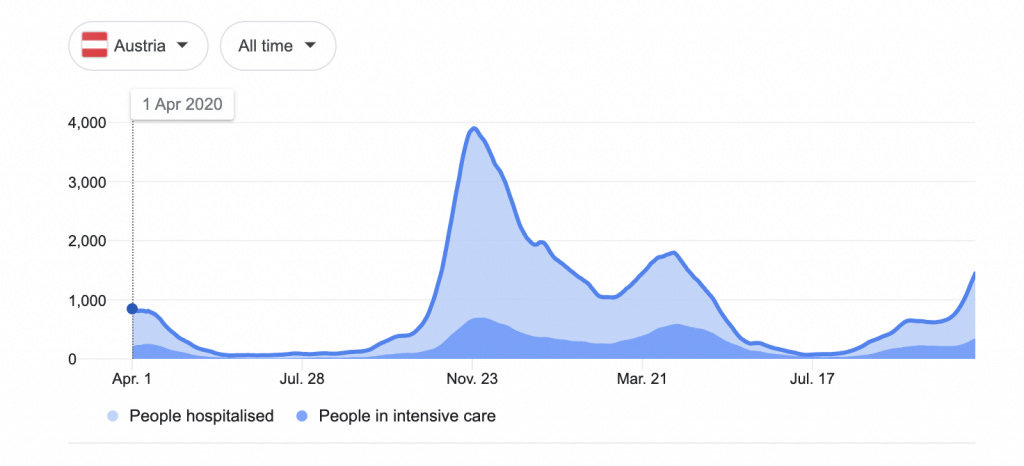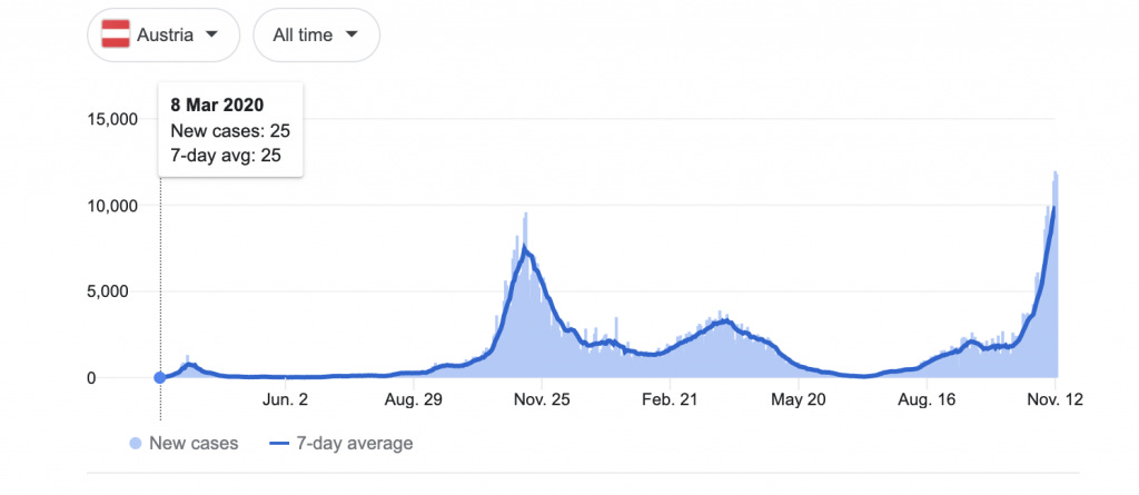 Daily cases in Austria are on the rise with 11,576 new cases on Wednesday and 11,040 new cases on Friday. As of Nov 7th, 1445 people are in hospital, with 347 in ICU. This is about half of the worst Austria saw back in Nov 2020 when 3901 people were in hospital and 682 in ICU.