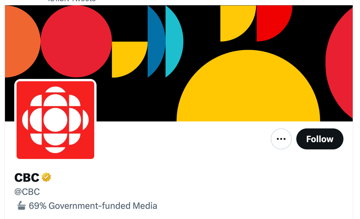 CBC in Canada is one of the latest organizations to receive the rating, initially being labelled “government-funded media,” but now labelled as “69% government-funded media.”