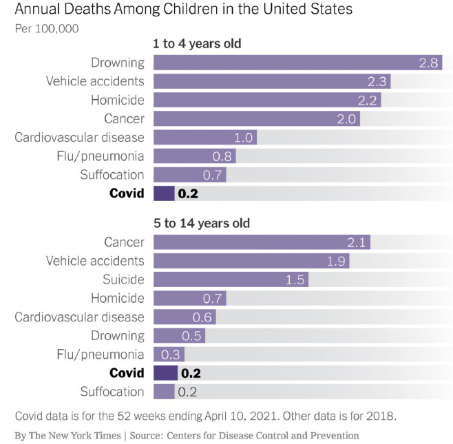 When it comes to morality risk to children, COVID-19 has a lower annual mortality risk than car accidents, influenza, and for 5-14 year olds, suicide (Leonhardt, 2021). In fact, the survival rate of COVID for people under the age of 19 according to recent pre-print study by two Stanford scientists is nearly 100 percent.