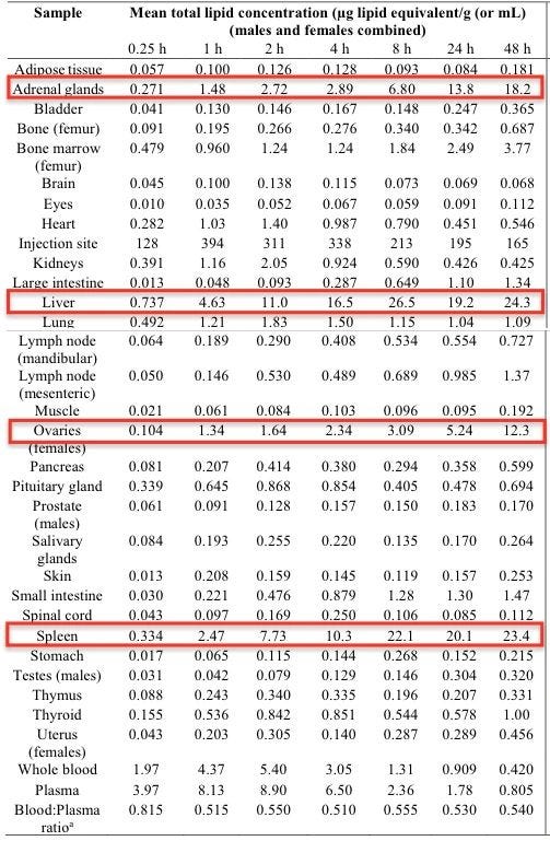 So what do we know today? Pharmacokinetics data has been provided by Pfizer to the European Medicines Agency (EMA). It showed that the contents of the vaccine did not stay at the injection site, and that one major site of distribution was the liver. As a result, the animals that received the Pfizer injection experienced adverse effects. The vaccine contents are distributed by what are called Lipid Nanoparticles (LNP), and it has been shown that empty LNP without mRNA does not result in any significant liver injury.