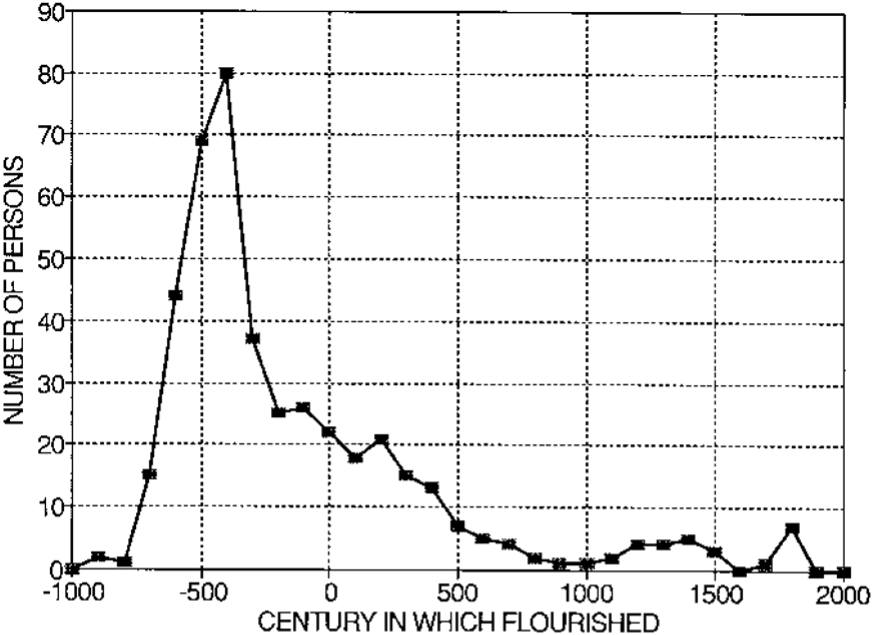 After making a myriad of contributions to human civilization for over a thousand years, Greece declined. Today, Greece is counted as one of the weakest links in the European Union. Depicted below is a plot of all people born in Greece and listed in all 23 volumes of the 1991 edition of Encyclopedia Britannica. The rise and decline of Greece is self-evident.