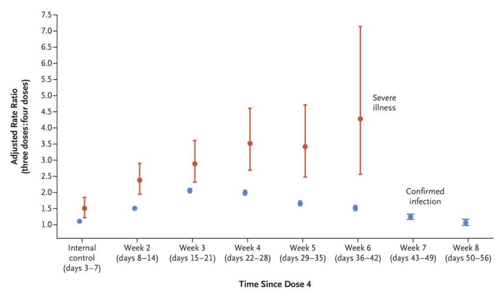 Vaccine effectiveness began to wane very early after the second booster (four weeks with regard to infection and seven weeks with regard to severe illness).