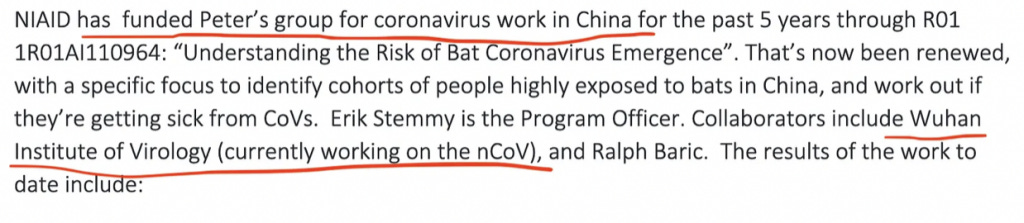 In a January 2020 email only made public in the last month, NIH officials created talking points for Anthony Fauci that discussed how his NIH institute had funded Peter Daszak’s group for coronavirus research in Wuhan for several years