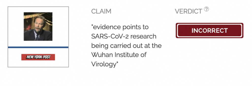 A separate page for Health Feedback rates as “incorrect” the New York Post claim that “evidence points to SARS-CoV-2 research being carried out at the Wuhan Institute of Virology.” However, this fact check is simply wrong