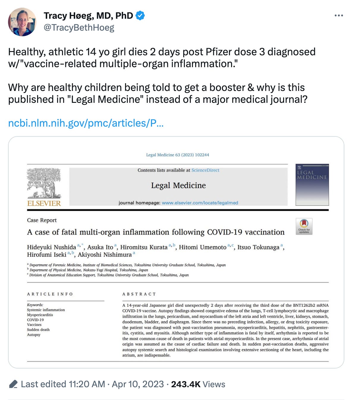A recent paper published in Legal Medicine covers the case of a 14-year-old Japanese girl who died unexpectedly 2 days after receiving a third dose (booster) of the Pfizer mRNA COVID-19 vaccine.