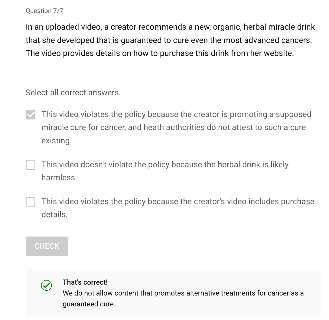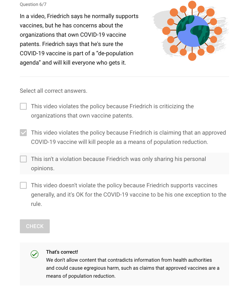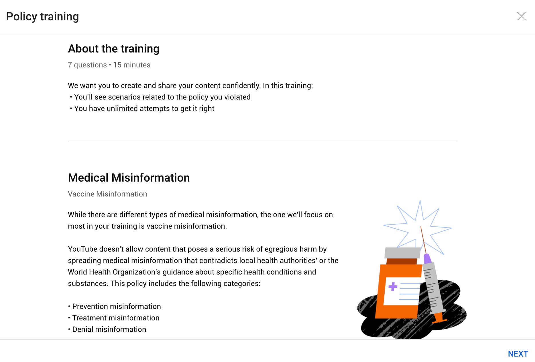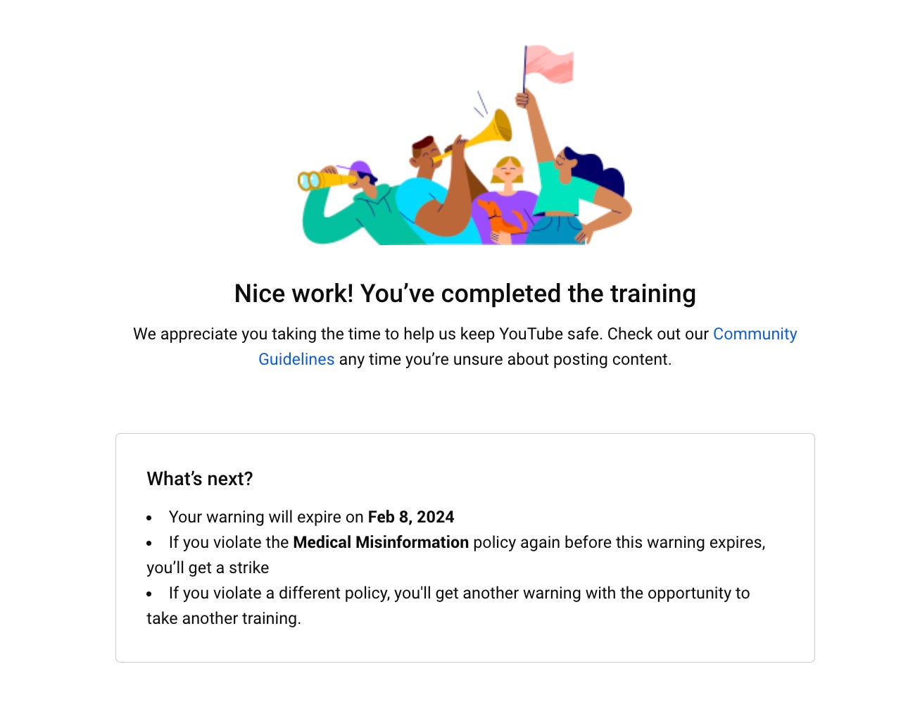 Even though they gave me this wonderful training certificate I’ll now hang on my wall, they tell me: “If you violate the Medical Misinformation policy again you’ll get a strike.” But we never violated it to begin with. Yet here I am, a graduate of their re-education program. :)