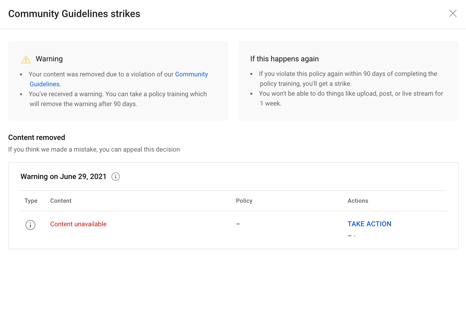 I get a notification on our YouTube channel. (I don’t use our channel much anymore as we don’t have time or staff to produce video content right now.) The notification said that if I take a training, YouTube will remove our warning in 90 days so long as we don’t break their rules again.