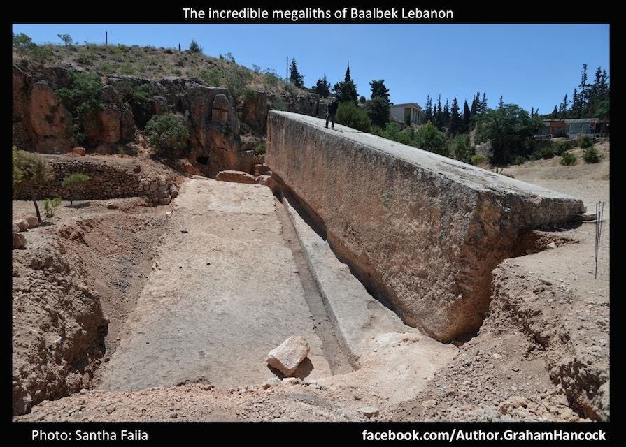 A great example is the giant block at Baalbek featured in the work of Graham Hancock, an Ancient Aliens contributor and author of books similar to von Daniken’s work but also more carefully researched.