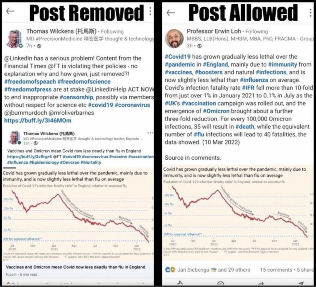 As many of you know, this heavy-handed approach is not unique to LinkedIn – YouTube, Twitter and Facebook are among the social media platforms censoring information purported to violate their “covid-19 professional community policies.”