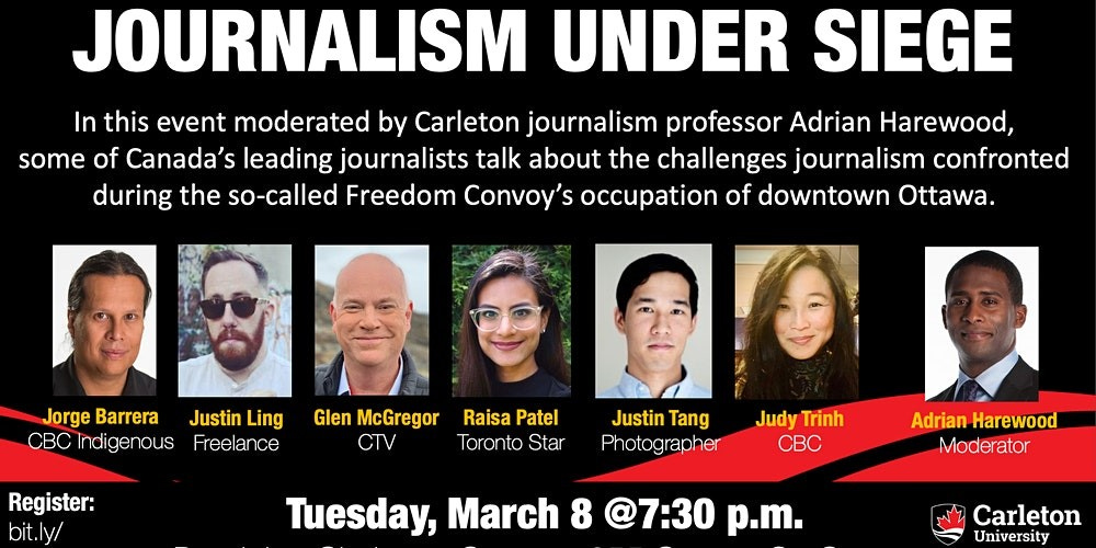 A panel of journalists discussed the unprecedented and historical event known as the Freedom Convoy at Carleton University Mar 10, 2022. The conversation was called, Journalism Under Siege and was led by a panel of journalists who covered the events on the ground over the course of the 20+ day protest in Ottawa.