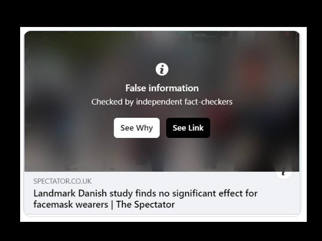 This (below) is the label Facebook slapped on the analysis by Professor Carl Heneghan and Tom Jefferson from Oxford University earlier on in the pandemic regarding a mask study. Facebook has already removed at least 16 million pieces of content from its platform, and added warnings to approximately 167 million others.