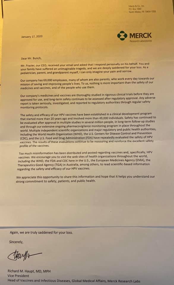 “So back on December 11th 2019 I sent an email to CEO Ken Frazier of Merck song to speak with him about the HPV VACCINE and how it killed my son and how it is destroying lives. Well here we are January 25th (the day I got it in the mail) and this is the response from Merck….”