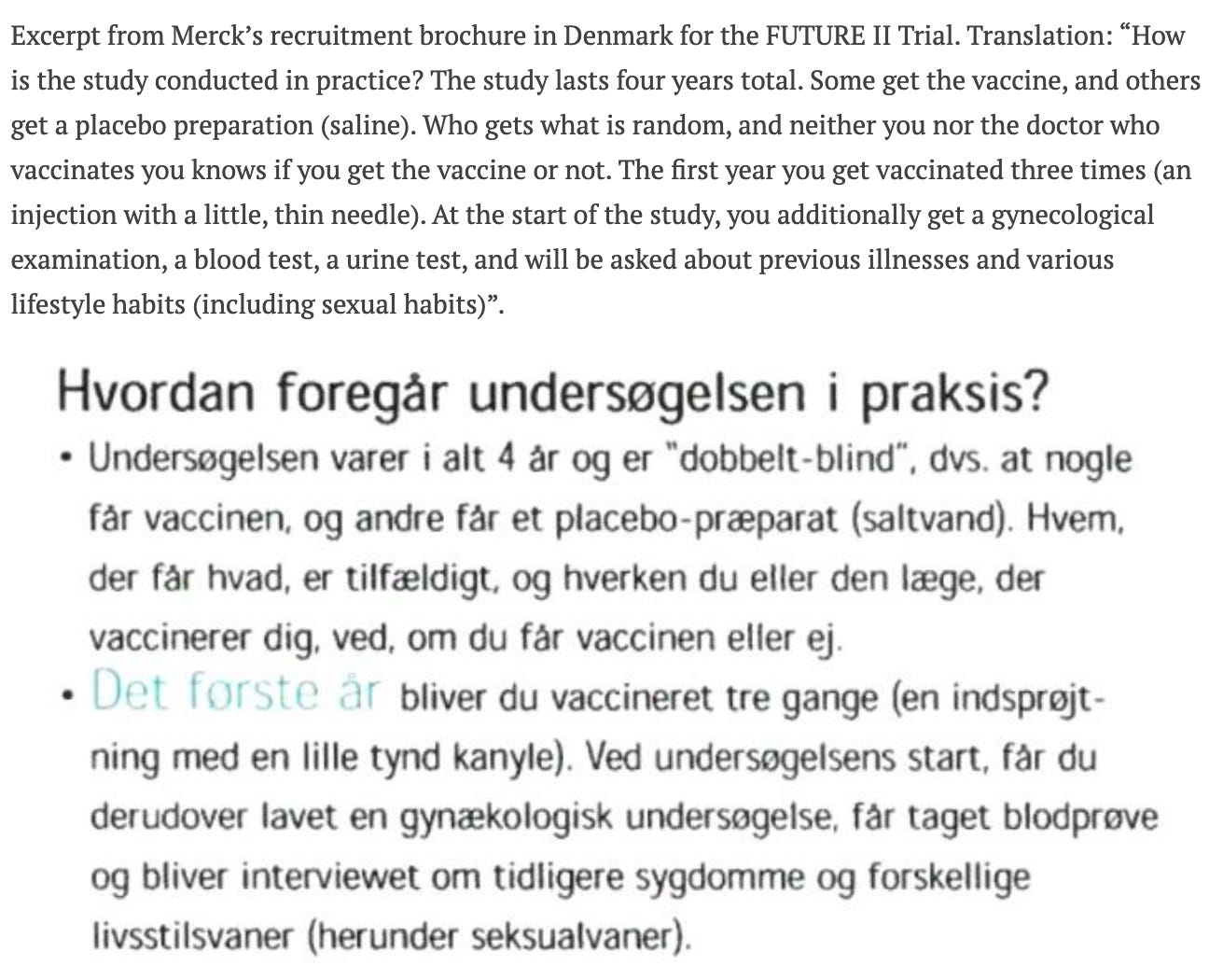 “We examined the informed consent form and the recruitment brochure for the FUTURE II Gardasil vaccine trial conducted in Denmark; and we interviewed several FUTURE II trial participants and their treating physicians. We also reviewed regulatory documentation related to Gardasil vaccine approval process and the guidelines on evaluation of adjuvants used in human vaccines.