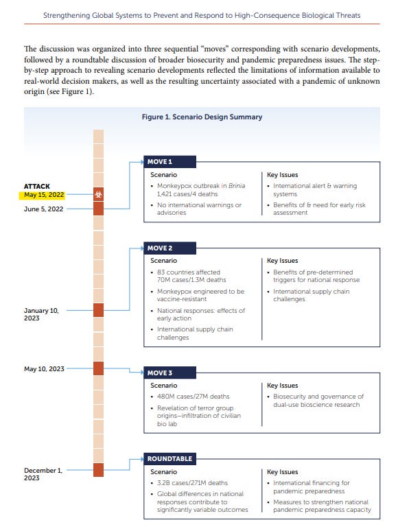 The global Monkeypox outbreak—occurring on the exact timeline predicted by a biosecurity simulation of a global Monkeypox outbreak a year prior—bears a striking resemblance to the outbreak of COVID-19 just months after Event 201, a simulation of a coronavirus pandemic almost exactly like COVID-19.