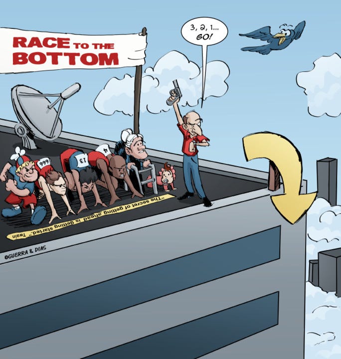 I’ve written about something quite similar with regard to technology in my piece called “The ‘Race To The Bottom’ Trap: Why Companies Produce Low Quality Crap” I also touched on some of these ideas in my piece “Moloch & Our Systems of Bad Incentives”