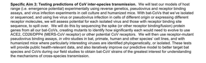 Newly public documents of two U.S funded grants reveal that one of the aims of the research included testing the ability to infect humanized mice with genetically altered coronaviruses. Humanized mice are engineered to display human type receptors on their cells to act as a human surrogate.