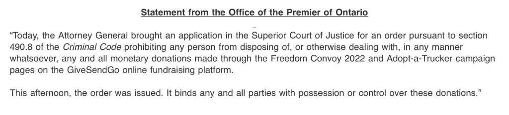 Today, the Ontario government won a court order blocking the use of “any and all monetary donations made through the Freedom Convoy 2022 and Adopt-a-Trucker campaign pages on the GiveSendGo online fundraising platform.”