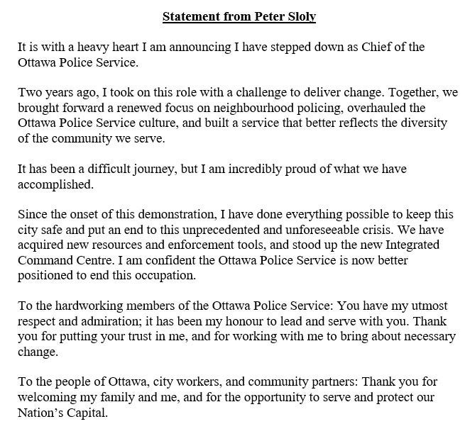 Below is a statement released by now former Ottawa police chief Peter Sloly.