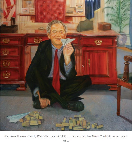Another one was of George W. Bush, called "War Games" which features the former president sitting on the floor of the White House playing with paper airplanes in front of two fallen Jenga towers, obviously implying his manipulation of the 9/11 attacks which were used to justify the invasion of Iraq for ulterior motives.