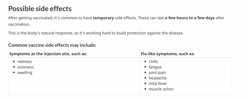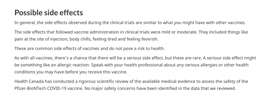 Below is the Pfizer side effects information as reported on the Government of Canada website on April 28, 2021. (Find archived website information here on Wayback archives.)