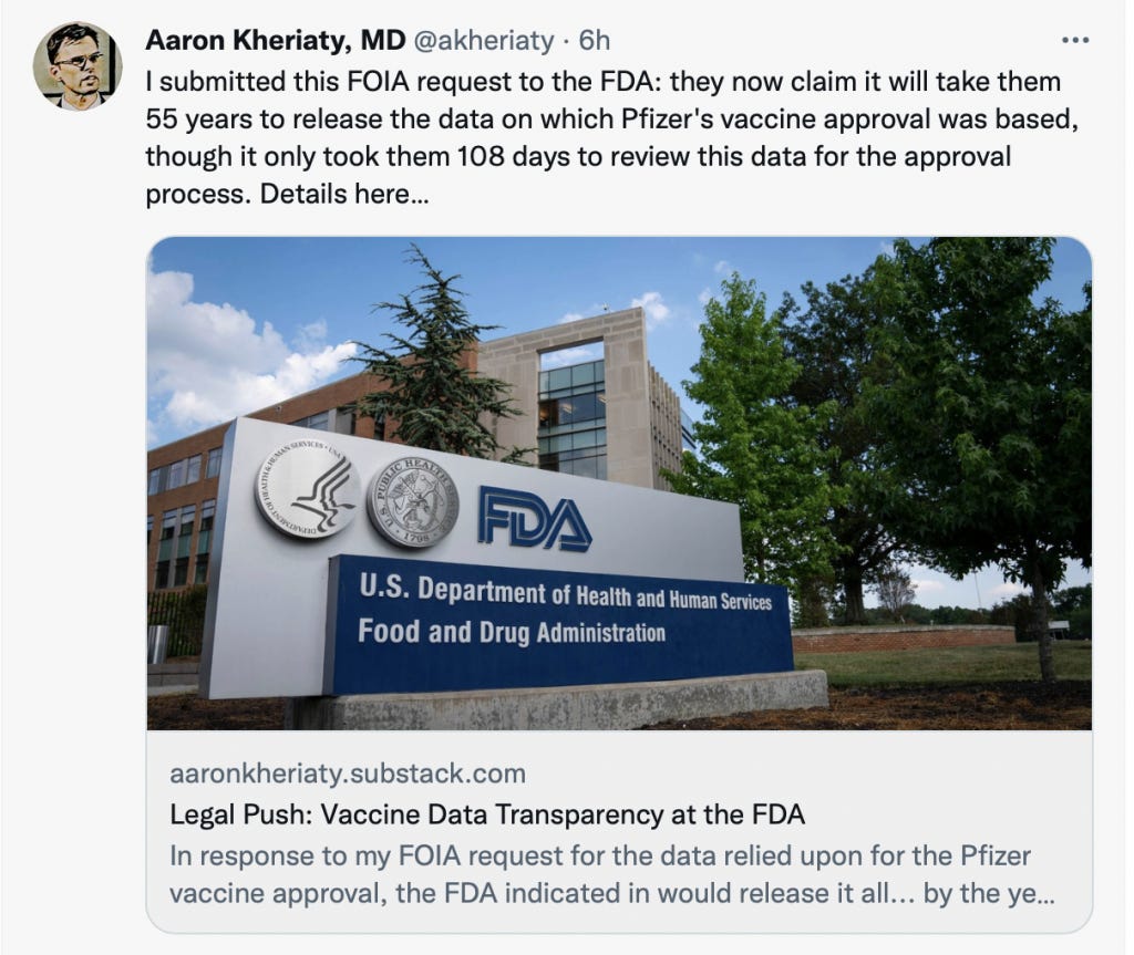 It will be 2076 before all documents the FDA used to approve the Pfizer vaccine will be made public if they are granted the 55 years to fulfill the FOIA request. If the number one goal is public health and the safety of people, why can't there be transparency?
