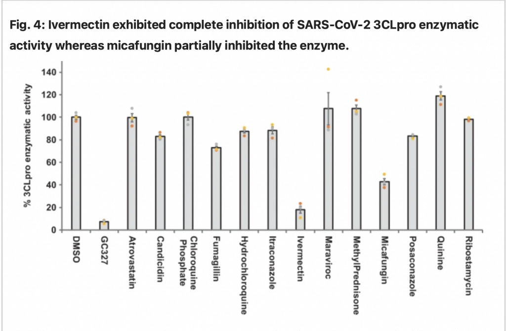 “We have identified that boceprevir, micafungin, ombitasvir, paritaprevir, and tipranavir exhibited partial inhibitory effect, whereas ivermectin was able to completely inhibit the SARS-COV-2 3CLpro enzymatic activity in vitro at the tested doses.”