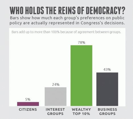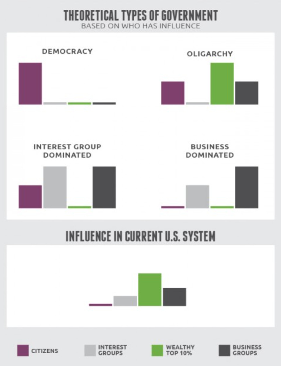 A study by two political scientists at Princeton and Northwestern, Martin Gilens and Benjamin Page, analyzed 1,779 recent policy outcomes found that “economic elites and organized groups representing business interests have substantial independent impacts on U.S. government policy,” while average citizens “have little or no independent influence.”
