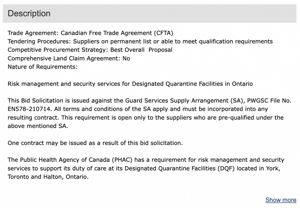 The Public Health Agency of Canada (PHAC) recently posted job openings for "risk management and security services for designated quarantine facilities in Ontario." Specifically in Toronto, York and Halton, Ontario.