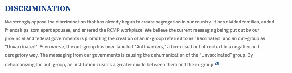 The group named Mounties for Freedom explain that vaccination mandates go against the Charter of Rights and Freedoms, and the Bill of Rights. They express major concern for the disregard of these founding legal documents that the country’s democracy was built on.