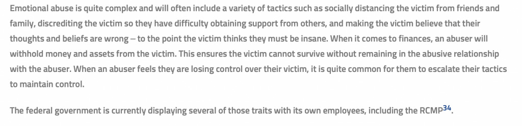 One of the more unique parts of the letter discusses how RCMP officers are educated in spotting signs of domestic abuse. Through this education, they are suggesting that what is taking place right now, via government, parallels how an abuser treats their victims.
