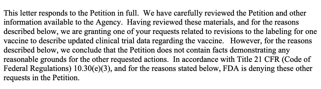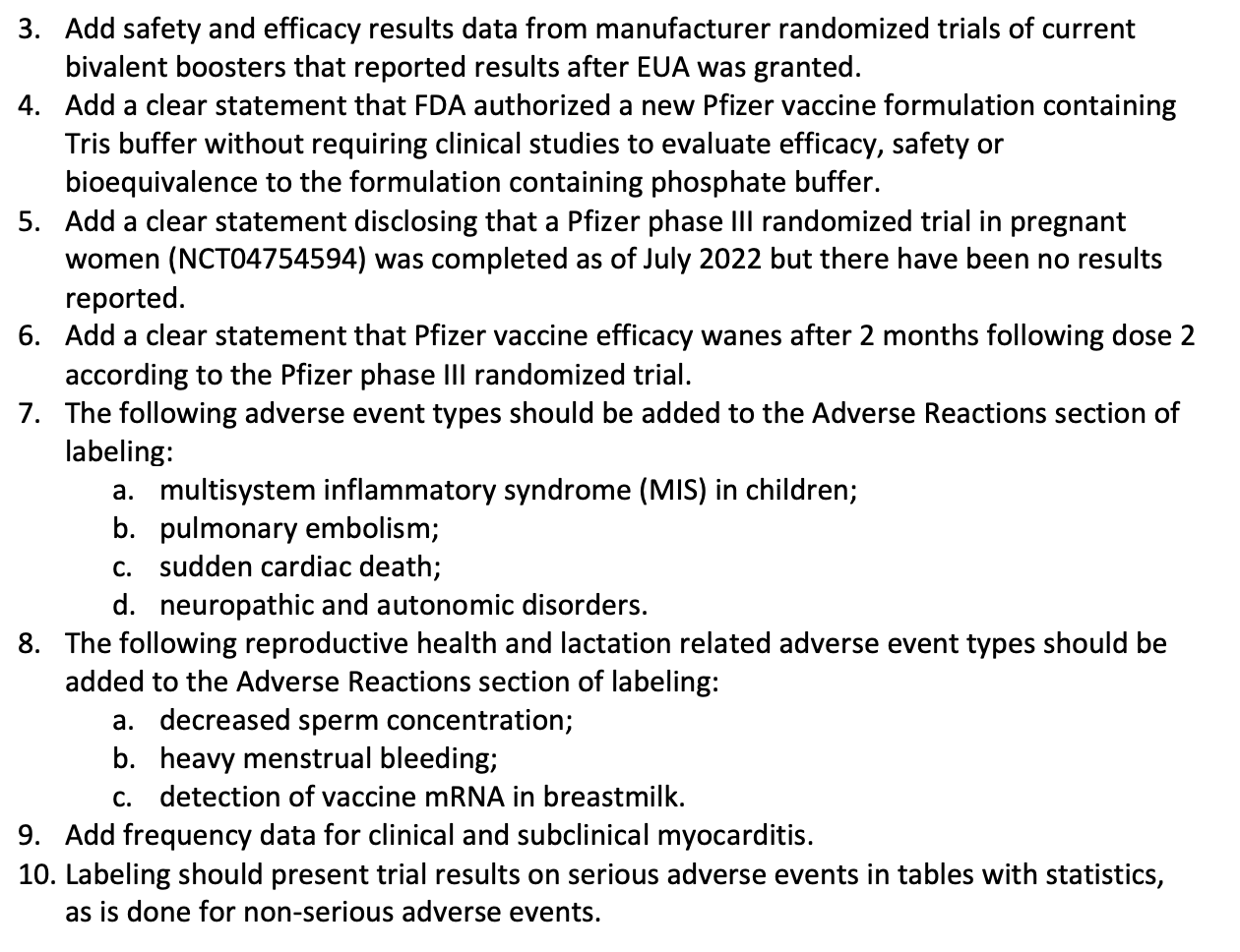 Firstly, they asked to “add language clarifying that phase III trials were not designed to determine and failed to provide substantial evidence of vaccine efficacy against SARVS-CoV-2 transmission or death.”