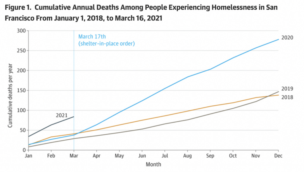 From Mar 17, 2020 to March 16 2021, there were 331 deaths, up from 147 the year before in the homeless population in San Francisco. When the city moved to a “shelter-in-place” order (lockdown) there was a spike in deaths, providing a signal that this COVID policy may be contributing to the increase in deaths.