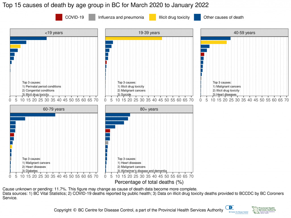 Below is a chart from the official B.C website that shows the major causes of death in each age group from 2020 to 2022.
