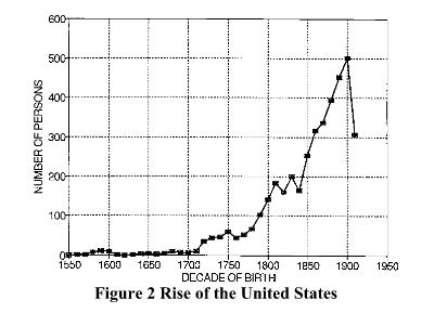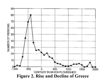 By way of corroboration, Figure 2 depicts the data on the rise and decline of Greece. This figure plots the number of persons born in Greece and listed in all the twenty-three volumes of the 1991 edition of Encyclopedia Britannica. That culture which produced giants like Aristotle, Plato, Socrates, Homer, Archimedes, and scores of others is today considered as the weakest link in the European Union. Rise and decline of Greece is self-evident.