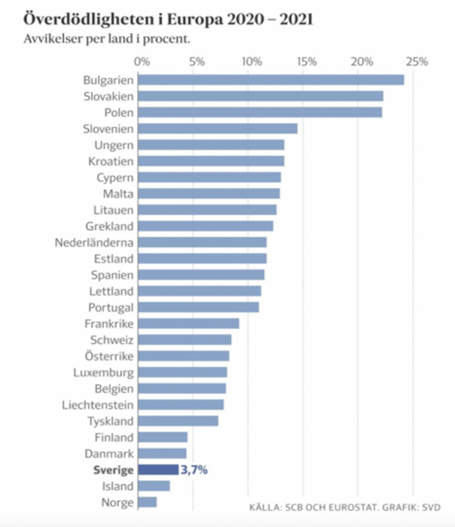 The below figure shows excess mortality (överdödligheten) in Europe in % by country in 2020 and 2021 with the country that dared never close schools, Sweden (Sverige), ending up near the bottom, above only Norway and Iceland.
