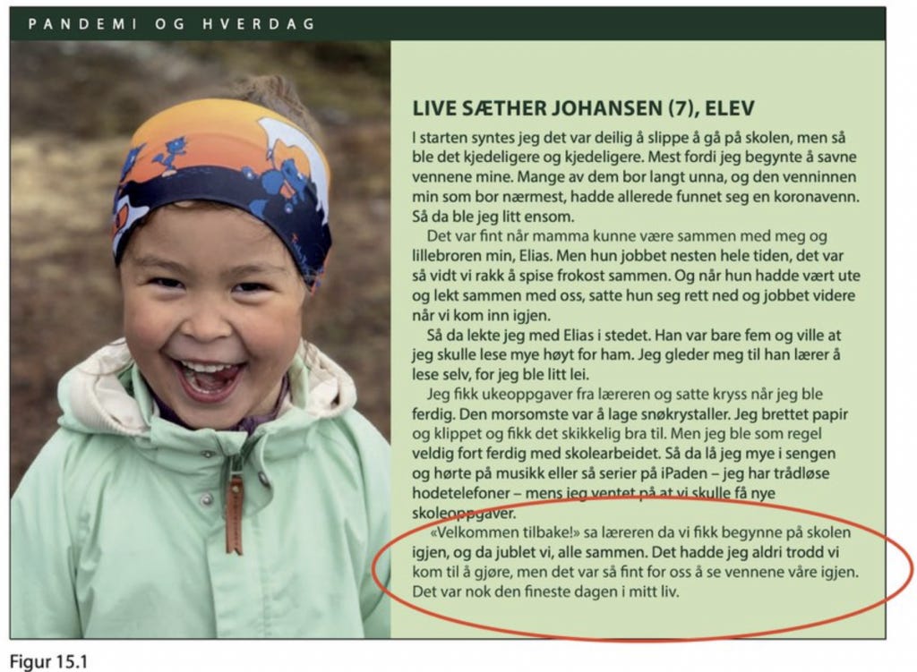 The Norwegian government interviewed children about how they felt about school closures and Live Sæther age 7 said the first day she went back was “probably the best day of [her] life”