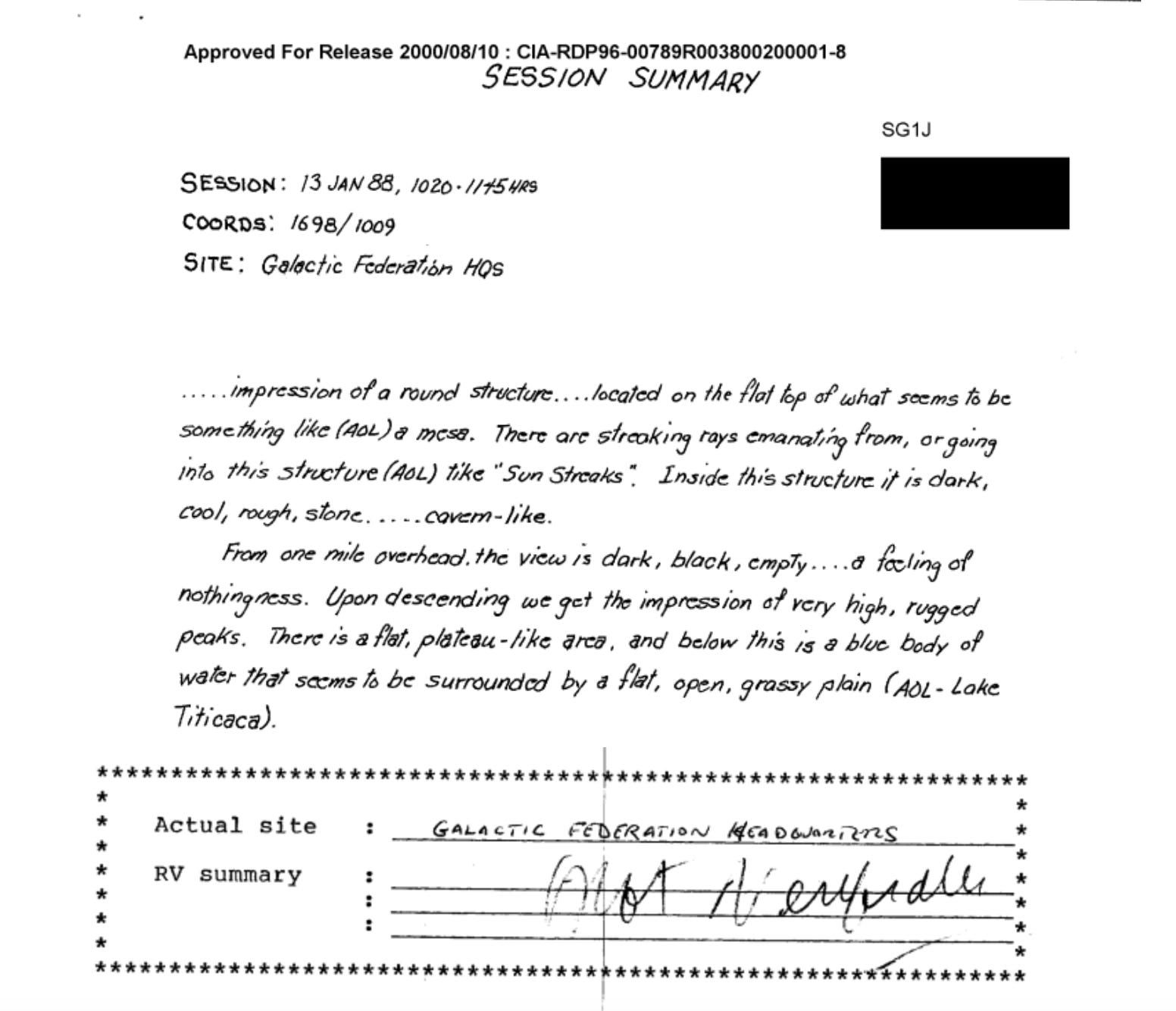 In one of the remote viewing sessions from 1988, a viewer was tasked with looking into a “galactic federation base” on Earth. You can access that declassified document here, again from the CIA electronic reading room.