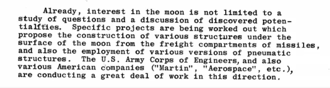 “It is not out of the question that artifacts of these visits still exist, or even that some kind of base is maintained (possibly automatically) within the solar system to provide continuity for successive expeditions. Because of weathering and the possibility of detection and interference by the inhabitants of the Earth, it would be preferable not to erect such a base on the Earth’s surface. The Moon seems one reasonable alternative. Forthcoming high resolution photographic reconnaissance of the Moon from space vehicles – particularly of the back side – might bear these possibilities in mind.”
