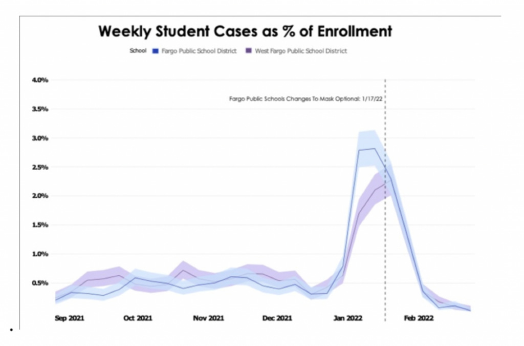 As you can see, in our study, in two demographically very similar K-12 geographically adjacent districts in the same municipality in Fargo North Dakota, there was no difference in student case rates (y axis) while the districts had different mask policies (FPS, in blue, had a mask mandate prior to the vertical line at 1/17/2022 and WF in purple did not) or when they had the same lack of mask mandate after 1/17/2022.