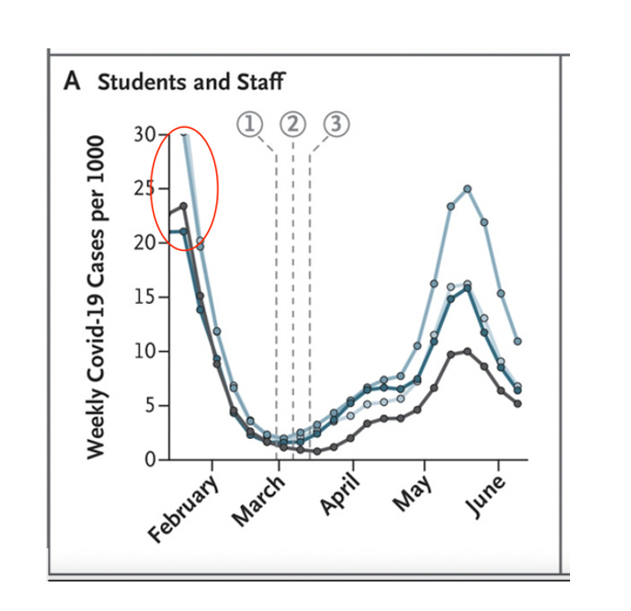In the Boston study, the identified masking effect size against cases that is implausibly high. They say the dropping of the mask mandates corresponded with an additional 11,901 cases, which was 33.4% of ALL cases in the unmasked districts. Among the staff they found 40.4% of the cases to be attributable to the lifting of the mask mandates.