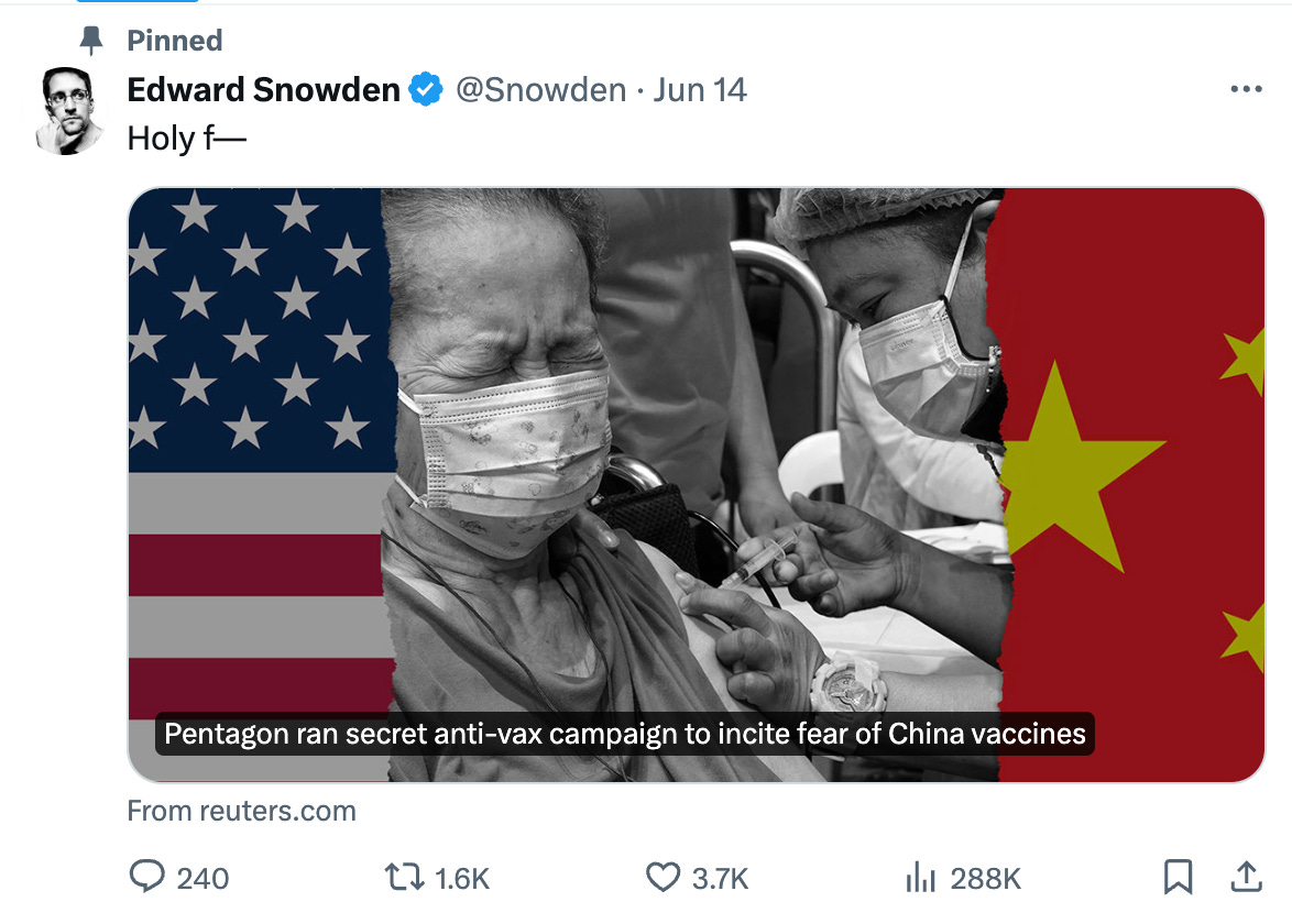 “The U.S. military’s anti-vax effort began in the spring of 2020 and expanded beyond Southeast Asia before it was terminated in mid-2021, Reuters determined. Tailoring the propaganda campaign to local audiences across Central Asia and the Middle East, the Pentagon used a combination of fake social media accounts on multiple platforms to spread fear of China’s vaccines…”